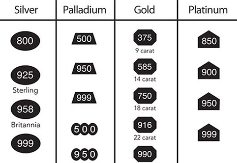 Not every piece of precious metal will have a hallmark, though. Silver under 7.78g, gold and palladium under 0.5g, and palladium under 1g in weight is not required to be inspected and stamped with a hallmark. While the UK and Europe have strict hallmarking rules, the guidelines are a little more lax in the US. Handmade jewelry from independent designers might not carry a hallmark.